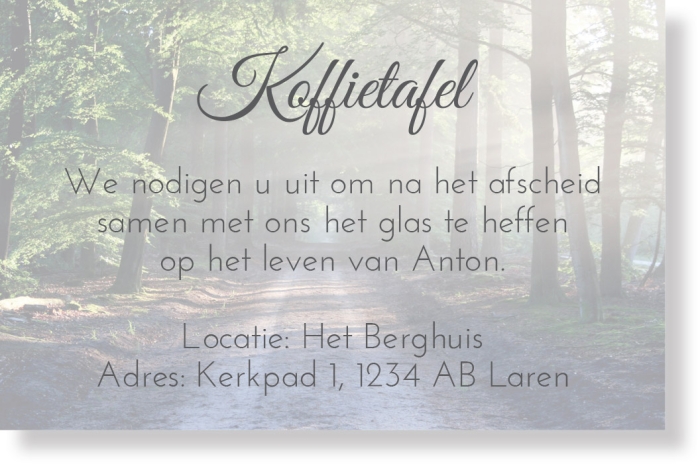 Naast uitvaartkaarten kun je bij Memento kaarten ook koffietafelkaartjes bestellen om na te praten. Dit kleine kaartje kun je toevoegen bij de rouwkaart voor de nodige informatie. Het kaartje is te bestellen op 8,5 x 5,5 cm.
